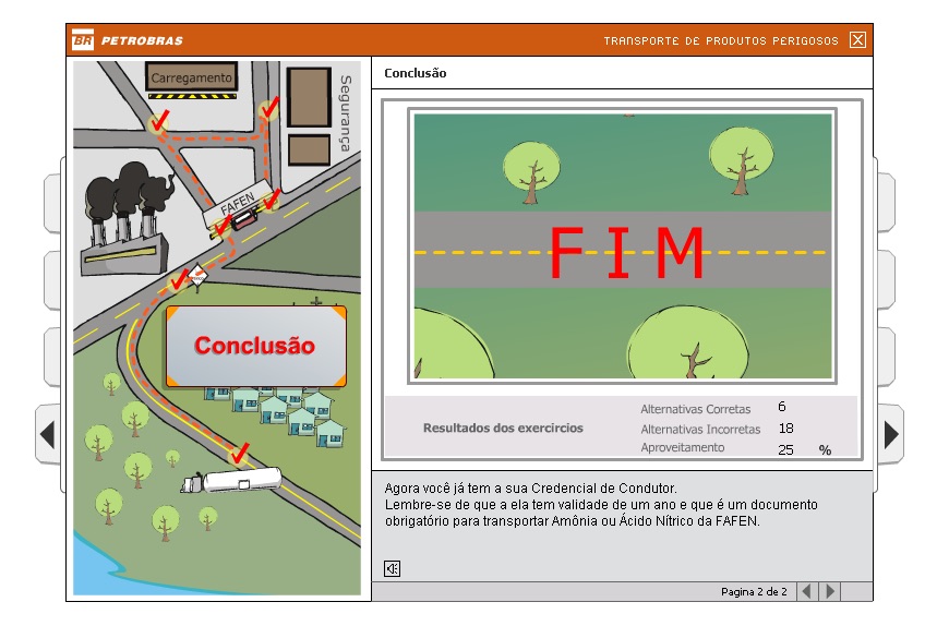 Quando o profissional se logava no sistema, o curso reconhecia o aluno e armazenava o progresso e o desempenho obtido em cada módulo, incluindo as notas dos testes realizados. Esse acompanhamento era revolucionário para a época e permitia que a Petrobras tivesse um controle preciso sobre a capacitação dos profissionais que precisavam entender as normas e as práticas de segurança em relação ao transporte de produtos perigosos.